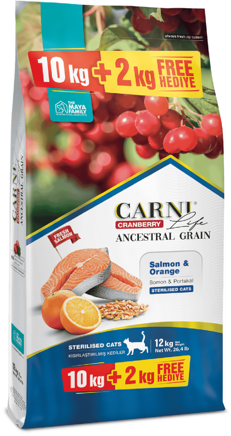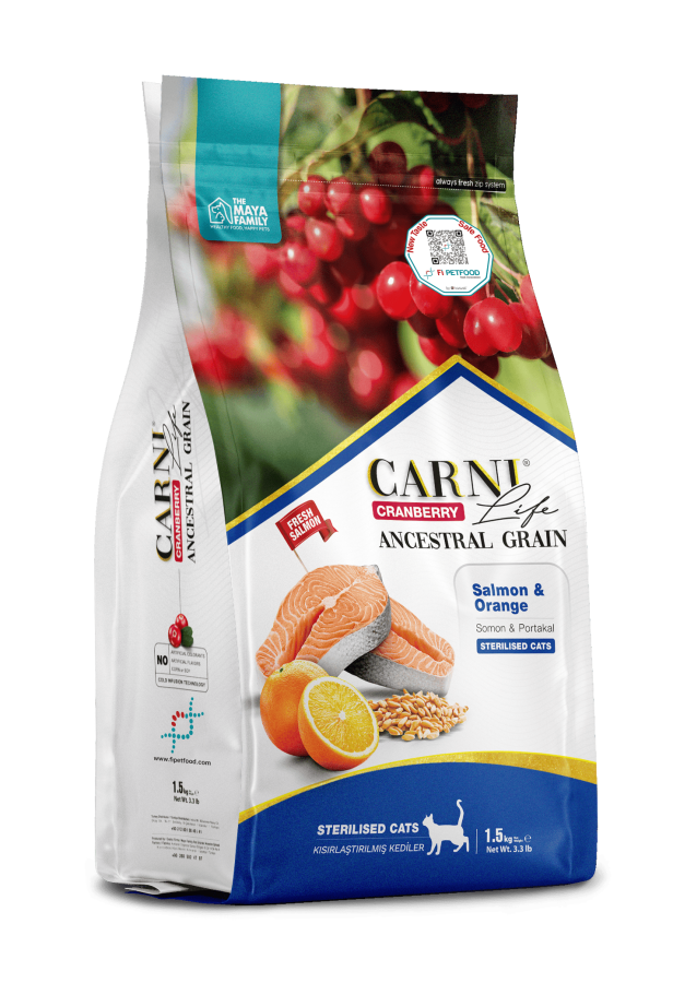 Somon eti (%25- bütün somon %14, somon proteini unu %11), kılçıksız buğday (%14), doğal ekstrakte bezelye unu, yulaf, kümes hayvanları protein unu, kurutulmuş tavuk eti, balık proteini unu, hidrolize tavuk, pancar posası lifi, balık yağı, ayçiçeği yağı, bezelye lifi, kuru kızılcık (%0,5), kuru portakal (%0,5), kuru havuç (%0,5), mannan oligosakkaritler (MOS) (%0,15), taurin (%0,1), L karnitin, inülin