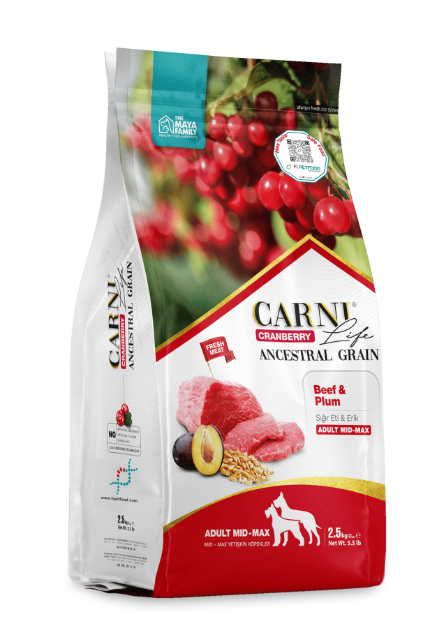 Taze sığır eti (20%), kılçıksız buğday (%20), doğal ekstrakte bezelye unu, kümes hayvanları protein unu, sığır proteini unu (%9), ayçiçek yağı, yulaf, hidrolize tavuk ciğeri, pancar posası lifi, keten tohumu, bezelye lifi, kuru kızılcık (%0,5), kuru erik (%0,5), Norveç ladininden MOS (%0,5), kuru havuç (%0,5), taurin (%0,1), karnitin (100 mg/kg), glukozamin (600 mg/kg), kondroitin (500 mg/kg), inülin, metiyonin, antioksidan